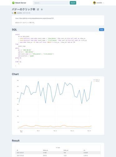 こんにちは。クックパッドでエンジニアをしている @morishin です。Bdash Server というデータ分析 SQL を共有するアプリケーションを作って社内で使い始めたのでその紹介をします。 クックパッドのサービス開発は「仮説を立てる」→「作ってリリース」→「効…